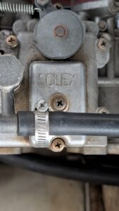 私の場合、1番キャブが23mm、2番キャブが25mmで全然狙い通りとはなっていなかったです。これをストリート向けの20mmに合わせます。調整する場所は二枚目の写真の中央部にある調整ネジです。10mmのナットの中に、調整ネジがあります。ここで油面を上下させます。一度調整したら、15秒程度アイドリングさせ、油面を安定させます。その後再度測定し、理想とする油面に調整します。
