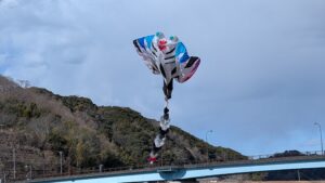川の駅城山で新年祭が行われていたので、川の駅の職員に新年のあいさつがてら、顔を出してきました。新年の遊びらしく、凧を上げていました。その凧、立体的なものでしかもとても大きく、風の多い河原でも、タイミングを読まないとなかなか上がらない代物でした。他にもパラグライダーの体験スポットがあり、テーマは【風】かな~なんて思いました。もちろんキッチンカーや小物の販売なんかもあり、年明けの週末をゆったりとした時間が流れていました。
